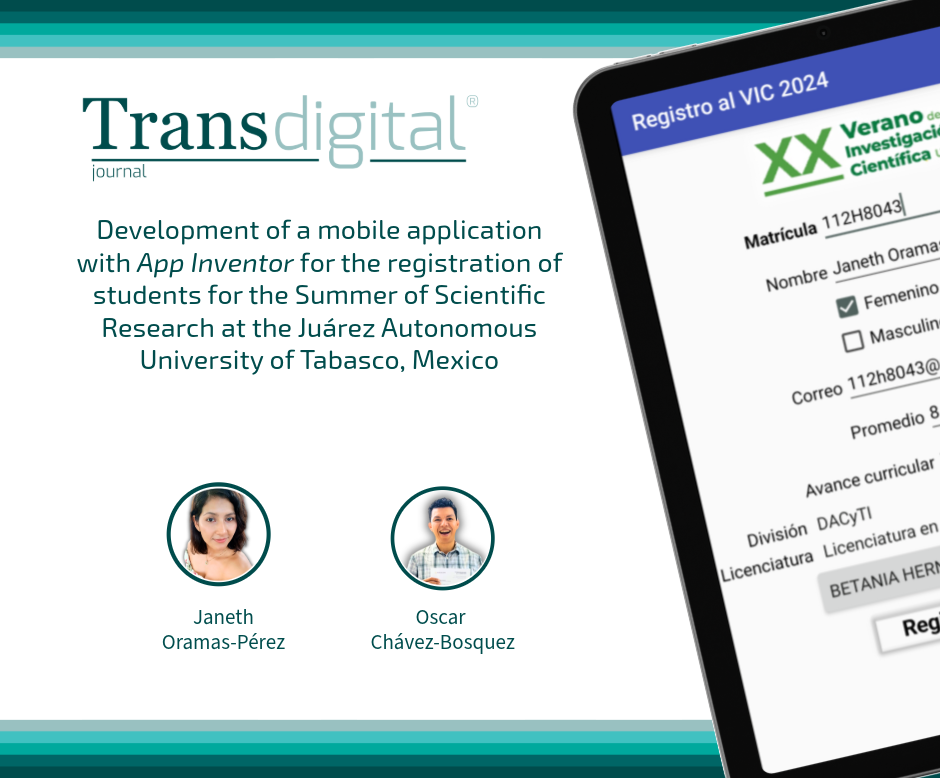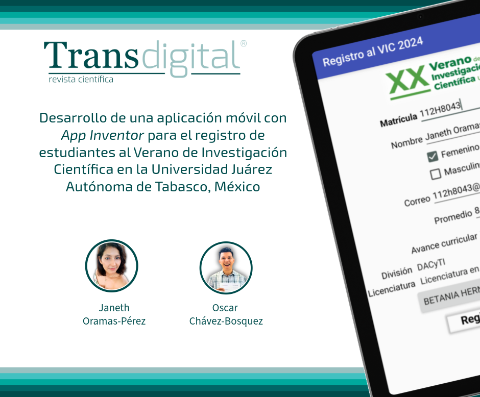 Oramas-Pérez, J., & Chavez-Bosquez, O. (2024). Desarrollo de una aplicación móvil con App Inventor para el registro de estudiantes al Verano de Investigación Científica en la Universidad Juárez Autónoma de Tabasco, México. Transdigital, 5(10), e358. https://doi.org/10.56162/transdigital358